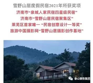 近日,泰山钢铁集团旗下的雪野山居项目入选济南市2021年“泉城人家四星级民宿”,以21间四星级民宿房间数量位列全市第一,成为今年争取到民宿专项资金最多的单位,并在民宿创意设计申报评比项目中以自然天成的设计理念独揽了民宿创意设计一等奖,成为莱芜区首家获得该等奖项的单位。