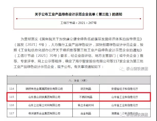为贯彻落实《国务院关于加快建立健全绿色低碳循环发展经济体系的指导意见》(国发〔2021〕4号),大力推行工业产品绿色设计,加快创建绿色设计示范企业,工业和信息化部近日公布第三批工业产品绿色设计示范企业名单,泰山钢铁集团榜上有名。