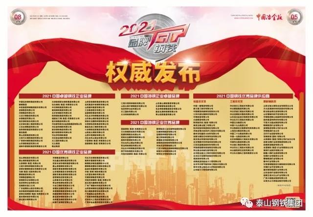 集团党委书记、董事长、总裁王永胜荣获“2020山东省循环经济十大年度人物”称号1月25日,备受关注的2020山东省循环经济年度盛典在山东电视台800演播大厅举行。集团董事长、党委书记、总裁王永胜荣获“2020山东省循环经济十大年度人物”称号,并出席本次盛典。“山东省循环经济年度人物”是经过社会推荐、专家论证等程序,从全省各行业中遴选出的突出企业、个人。这项荣誉的获得也是省委省政府对泰山钢铁集团坚定不移落实党和国家要求、探索循环经济发展之路,实现了企业经济效益、环境效益和社会效益和谐统一的高度认可。集团召开“学习、实践、创新、提高”主题活动动员大会4月30日,泰山钢铁集团在中心会堂召开“学习、实践、创新、提高”主题活动动员大会,集团党委书记、董事长、总裁王永胜在会上发表讲话。本次会议,是在世界面临百年未有之大变局,钢铁行业进入新阶段,我们泰钢面临新挑战的特殊形势下召开的一次十分重要的会议,目的是动员和激发全体干部职工把学业务、学技能当作岗位成才的主要通道,把争先进、争模范当成事业成功的重要标志,从而顺利实现职工职业素养和企业发展质量的双提升,为建设“五个新泰钢”提供强劲动力,为打造“千亿级不锈钢集群”积蓄澎湃力量!5月9日,值我国第五个中国品牌日之际,新华社、中国品牌建设促进会、中国资产评估协会、国务院国资委新闻中心等单位在上海国际会议中心举行“2021中国品牌价值评价信息发布暨中国品牌建设高峰论坛”。在发布的“2021中国品牌价值评价信息”中,泰山钢铁集团以品牌价值39.93亿元,强度809,位列冶金有色组第十三位。