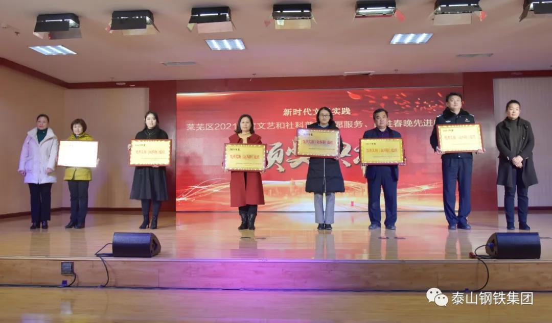 1月17日,济南市莱芜区在莱芜区图书馆举行戏曲春晚暨区文艺和社科普及志愿服务、百姓春晚先进典型颁奖典礼。会上表彰了一批在社科普及、文艺活动及志愿服务中作出突出贡献的先进集体和个人。其中,泰钢文联荣获“莱芜区2021年度优秀文联(社科联)组织”荣誉,泰钢文联铁流影视协会荣获“莱芜区2021年度优秀志愿服务协会”荣誉,泰钢文联会员谷文静荣获“莱芜区2021年度优秀文艺志愿者”,会员李鑫、张玉华荣获“莱芜区2021年度优秀社科普及志愿者”。