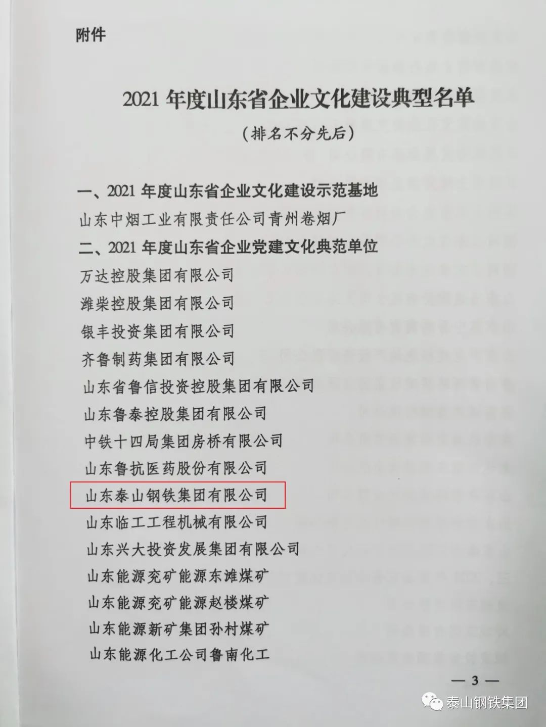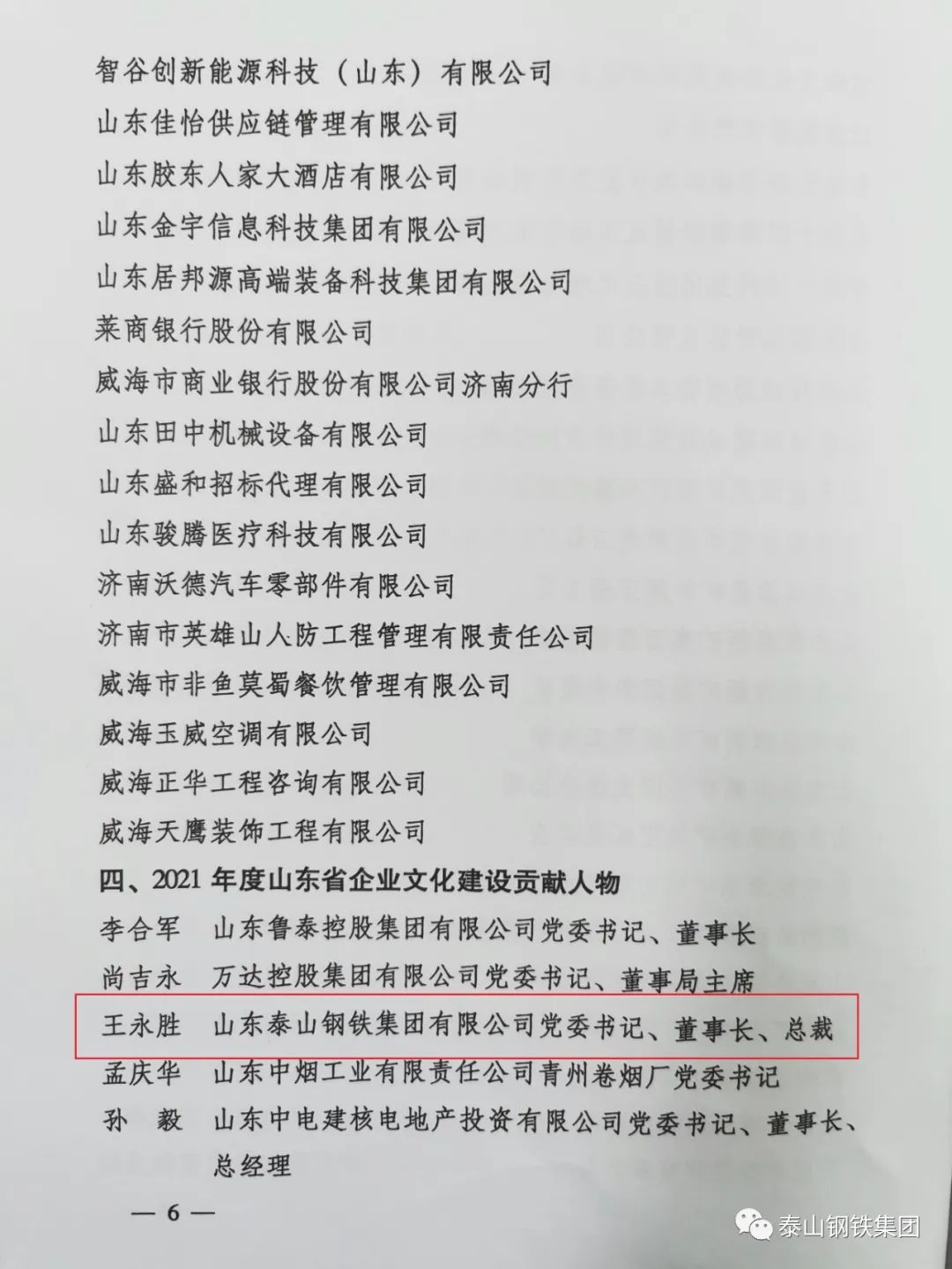 近日,山东省企业文化学会下发了《关于发布2021年度山东省企业文化建设典型名单的决定》文件,表彰了一批企业文化建设典型单位和个人。其中,泰山钢铁集团被授予“2021年度山东省企业党建文化典范单位”荣誉称号,集团党委书记、董事长王永胜获得“2021年度山东省企业文化建设贡献人物”荣誉称号。