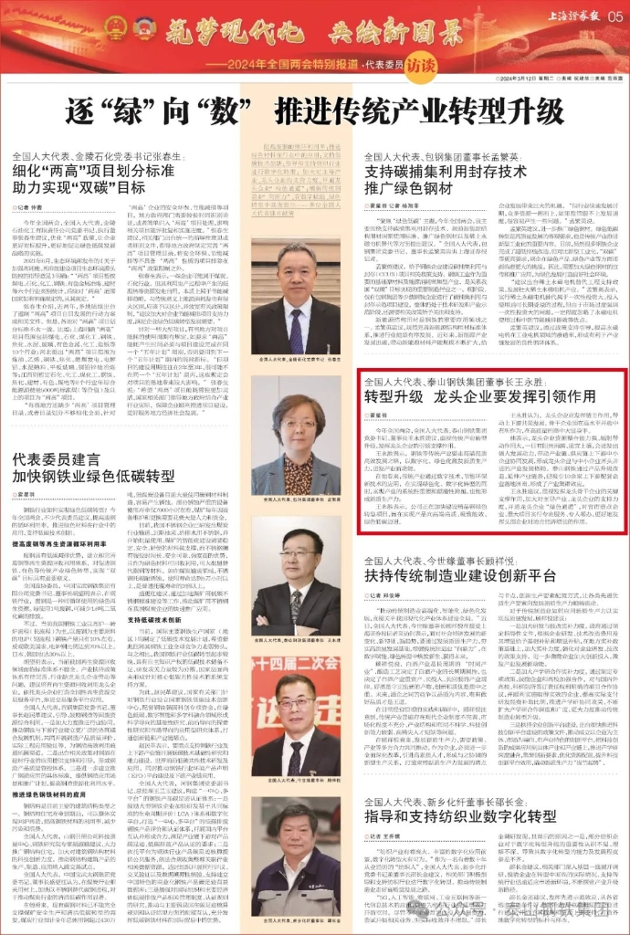 不能把传统产业当成“低端产业”简单退出,而是要通过转型升级走好高端高质高效发展之路。王董事长的“泰钢方案”被《人民日报》《中国青年报》《证券时报》《大众日报》《上海证券报》等多家媒体报道、转载。