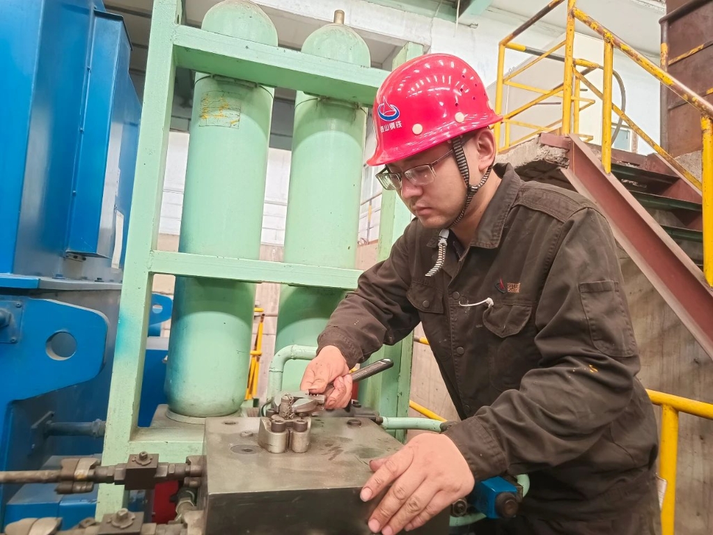 “设备就是生产的命脉,一定要守护好。”这是张继迎常挂在嘴边的话。他每天都会提前来到岗位,仔细检查每台设备的运行情况;每当遇到维修任务,他会毫不犹豫地冲锋在前。2022年设备大修期间,维修人员在更换卷取机液压油管时遇到了棘手难题:重达60斤的油管需要在极其狭窄的空间内完成更换。就在工作陷入僵局时,张继迎挺身而出:“让我来试试!”经过仔细观察后,他带着工具俯身钻进狭小的作业空间内。他尽管工作服上浸染了油污,汗水模糊了视线,但依旧没有停下手里的工作。经过数小时的持续奋战,他顺利完成了卷取机液压油管更换任务,大大缩短了维修时间。