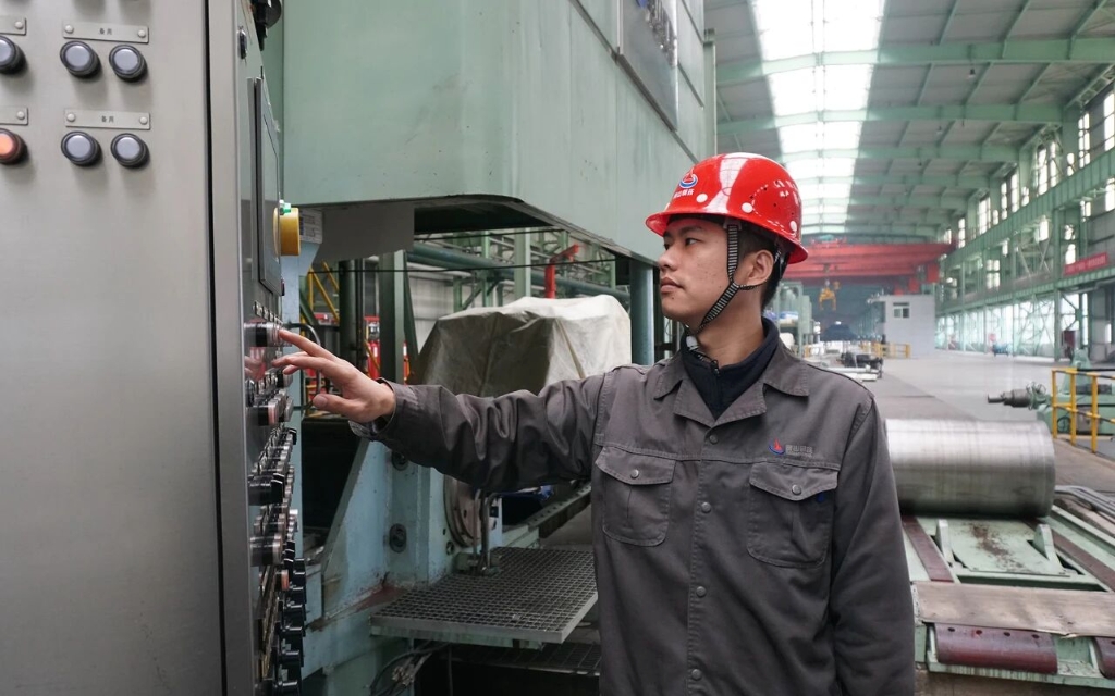 “轧钢是精细活,一丝一毫的偏差都可能影响产品质量。”这是王锟常常挂在嘴边的话。在轧钢产线,板形仪和传统的棒击法相结合是保障板坯表面平整度的重要手段。其中,棒击法这门依靠经验与手感的技艺,没有固定公式可循。为啃下这块硬骨头,王锟每天下班后都主动留在车间反复练习,一次次调整锤击的角度、力度,细心捕捉钢带变化。正是这份对技艺的极致执着与不懈打磨,让他快速成长为车间里独当一面的技术骨干。