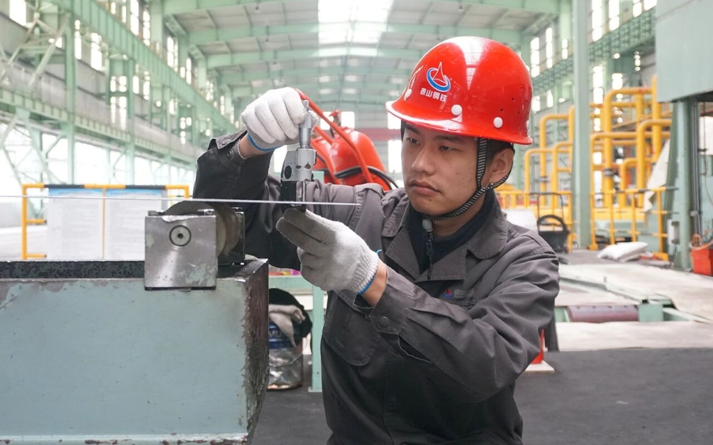 在集团泰嘉新材料轧钢车间的二号轧机旁,轧钢作业区丙班班长、25岁的内聘技师王锟,正蹲在操作台边,用卡尺仔细测量着钢带数据。